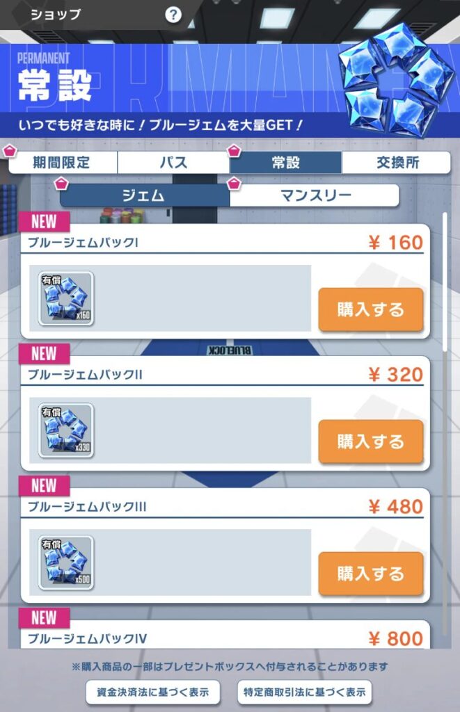 ゲーム内で使用する課金通貨は「ブルージェム」。